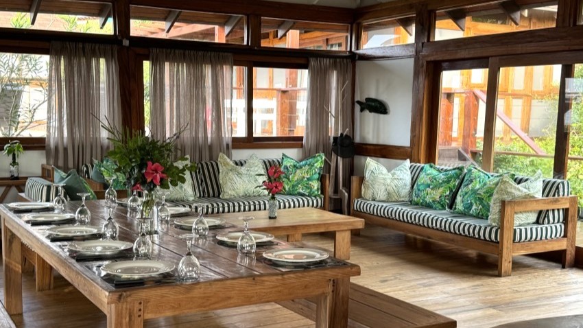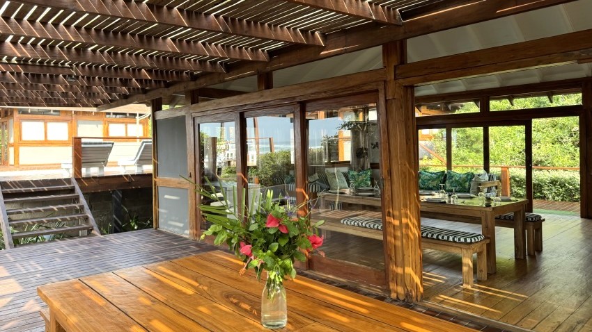 The main living area opens onto the pool deck with sparkling pool and comfortable pool side recliners.