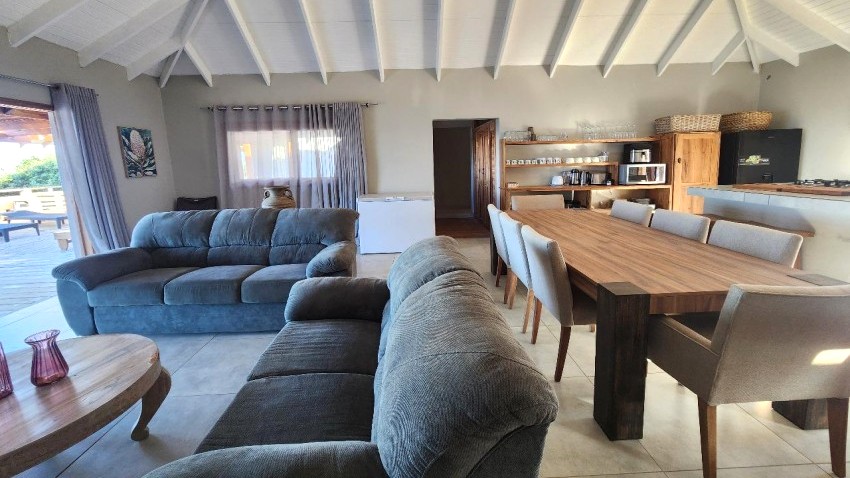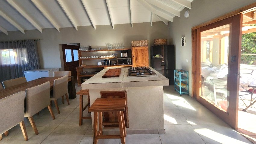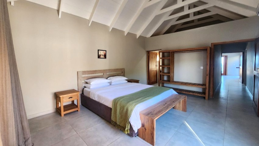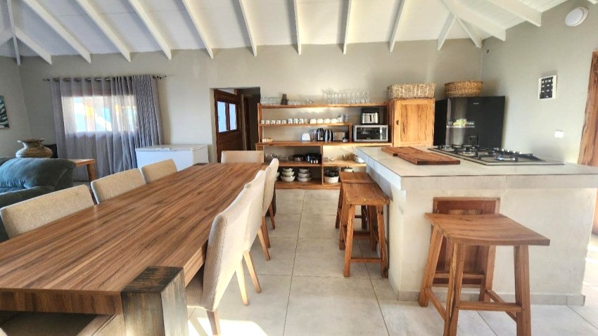 The living area is a light and airy space and encompasses a fully equipped kitchen, a dining area, and a comfortable lounge with a comfy sofa. Guests can enjoy complimentary Starlink Wi-Fi, and there is a cosy boma braai area at the rear of the house, perfect for evenings under the stars.