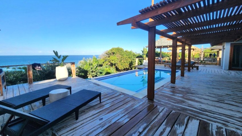Step out from the living room onto a stunning outdoor deck, featuring a sparkling rimflow pool and breathtaking views of the ocean.