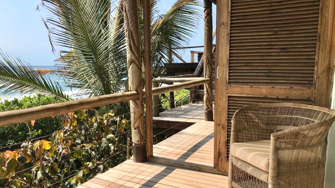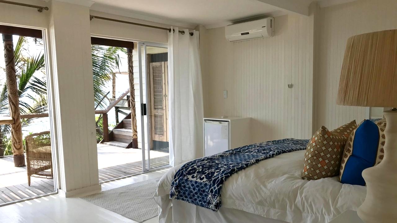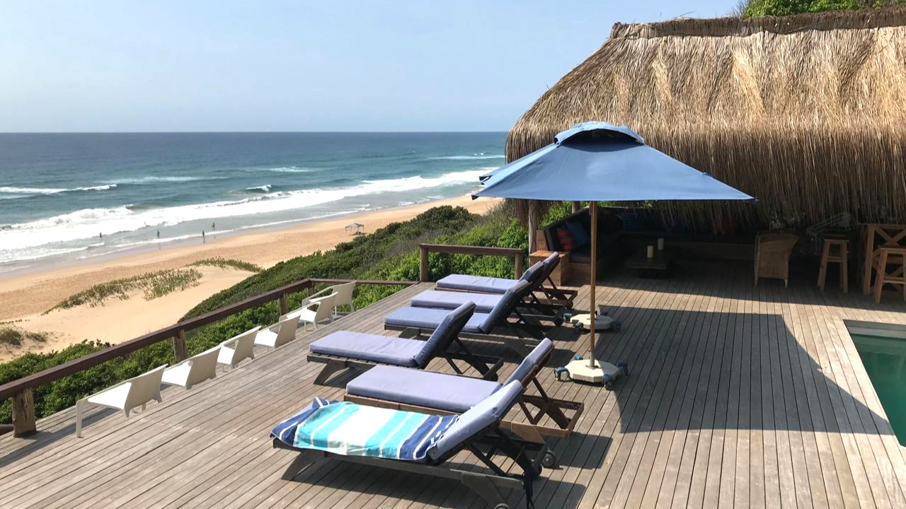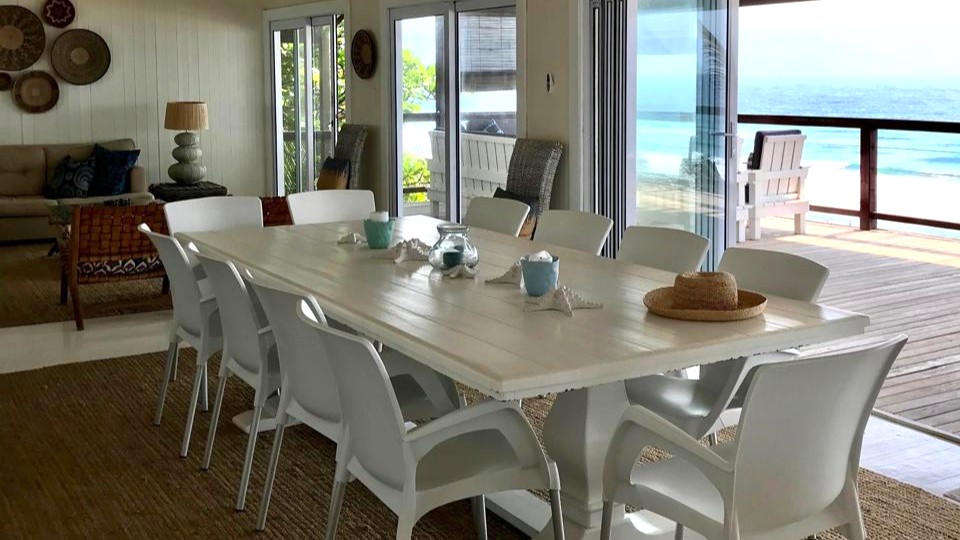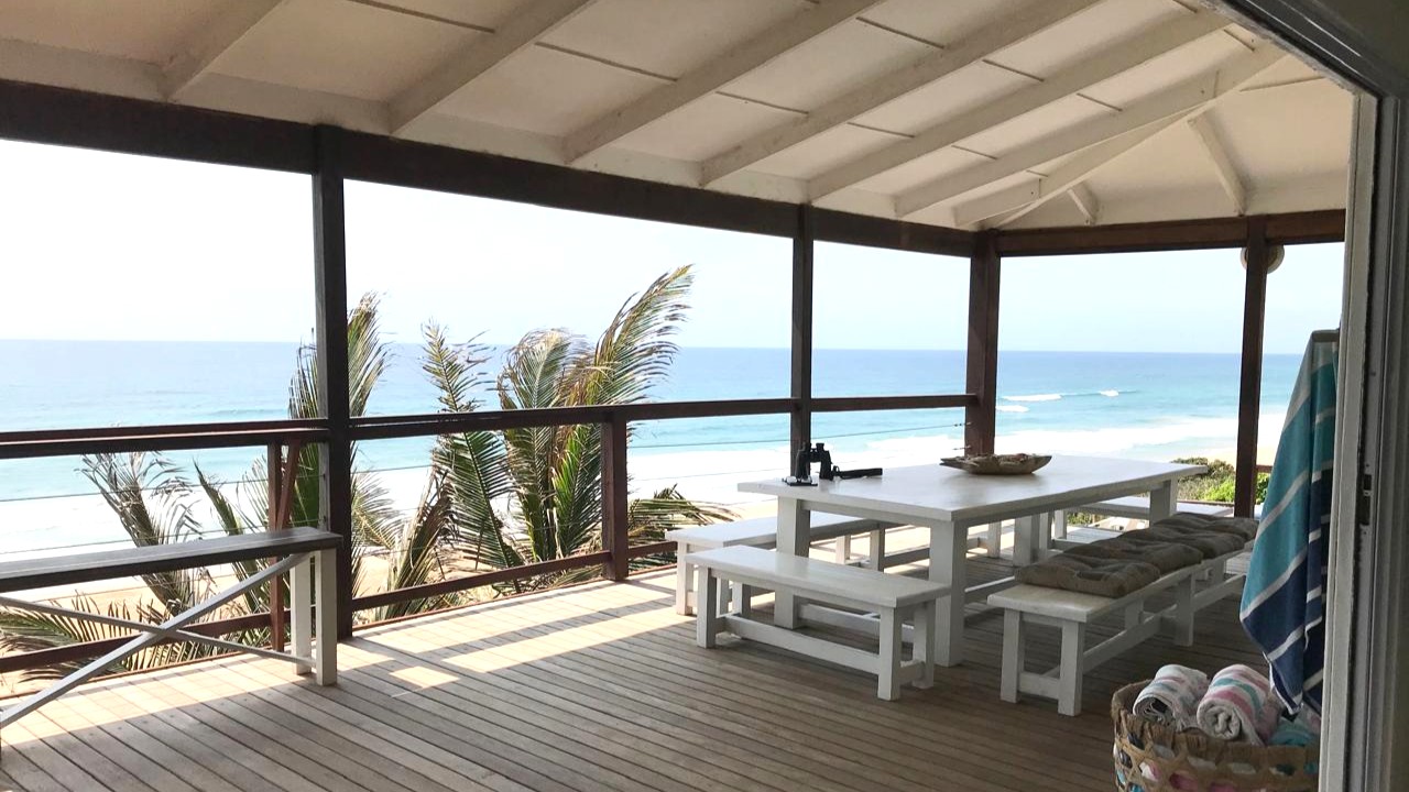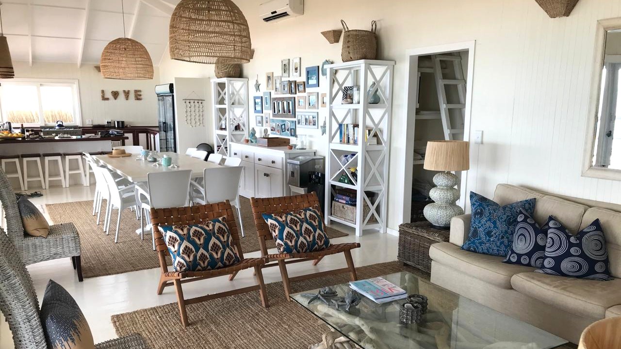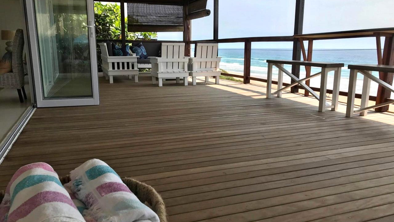 Wide stacking doors open onto a wooden deck that spans the full width of the house, leading down a few steps to the pool area and a covered thatch gazebo. Sun loungers are perfectly positioned to overlook the turquoise sea, only steps from the house. The existing pool is scheduled to be upgraded to a rim-flow pool in the coming months.