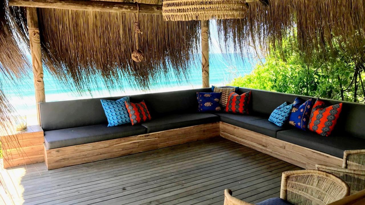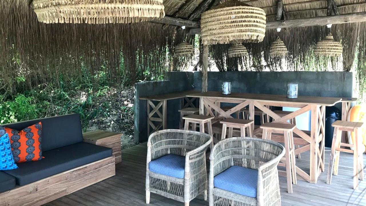 Designed in traditional Mozambican thatch, the gazebo creates a charming outdoor entertainment space complete with integrated seating and a bar counter.
